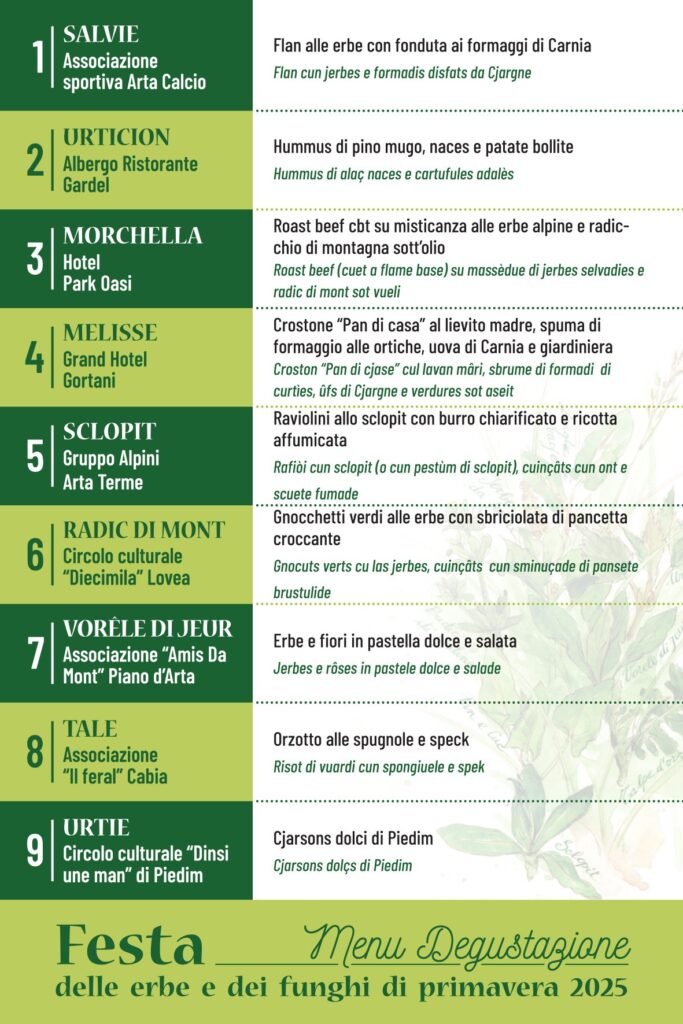 Solo Domenica 18 Maggio, le vie del paese si animeranno con l’esposizione di prodotti tipici locali e la possibilità di degustare il menù proposto ed elaborato con i prodotti protagonisti della festa. Qui la gastronomia è di alto livello, con piatti a base di erbe di montagna e prodotti carnici. (Menù qui sotto).
