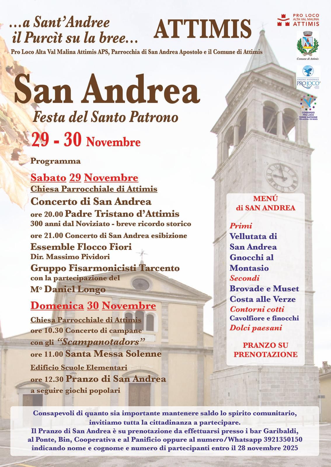 La Festa patronale dedicata a San Andrea di Attimis (UD), è una tradizionale sagra con riti religiosi, ma anche con ottimo cibo e intrattenimento. Domenica 30 Novembre qui si potranno mangiare vellutata di Sant’Andrea, gnocchi al montasio, brovade a muset, costa alle verze, cavolfiori e finocchi cotti e dolci fatti in casa. Ma ci saranno anche giochi popolari, gli Scampanadors, i fisarmonicisti di Tarcento e tanta allegria.