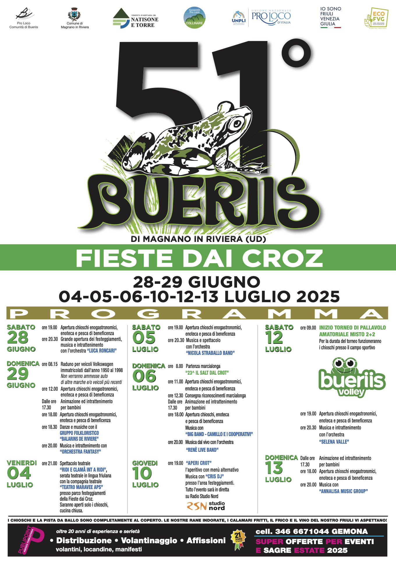 Giunta alla sua 51a edizione, la bellissima sagra delle rane di Bueriis è una festa dall’atmosfera autentica e in cui ogni sera si balla il liscio! Qui saranno tantissime le orchestre ad allietare le vostre serate come quelle di Renè, Selena Valle, Luca Roncari, Annalisa Music Group, Orchestra Fantasy, Nicola Straballo e tanti altri.