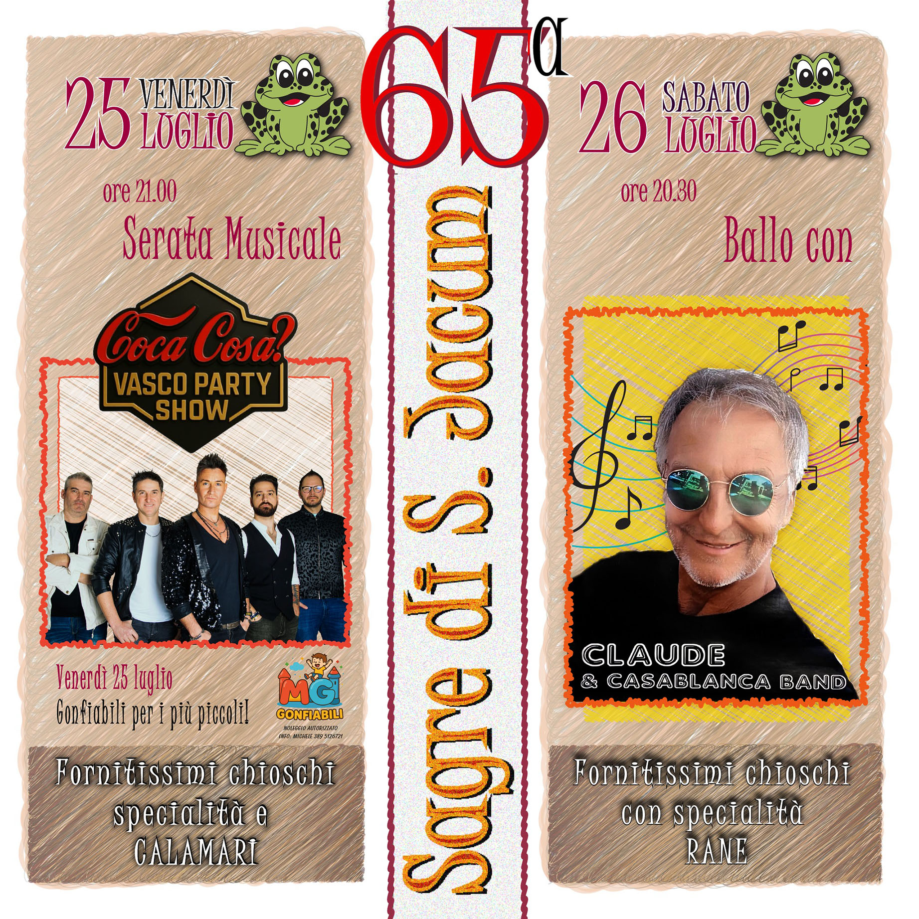 Così come non mancherà la musica con i Coca Cosa (Tribute Band di Vasco Rossi (Venerdì 25 Luglio), e Claude e Casablanca Band (Sabato 26). Inoltre troverete intrattenimento per i più piccoli, mostre d’arte, giochi gonfiabili e tanta allegria.