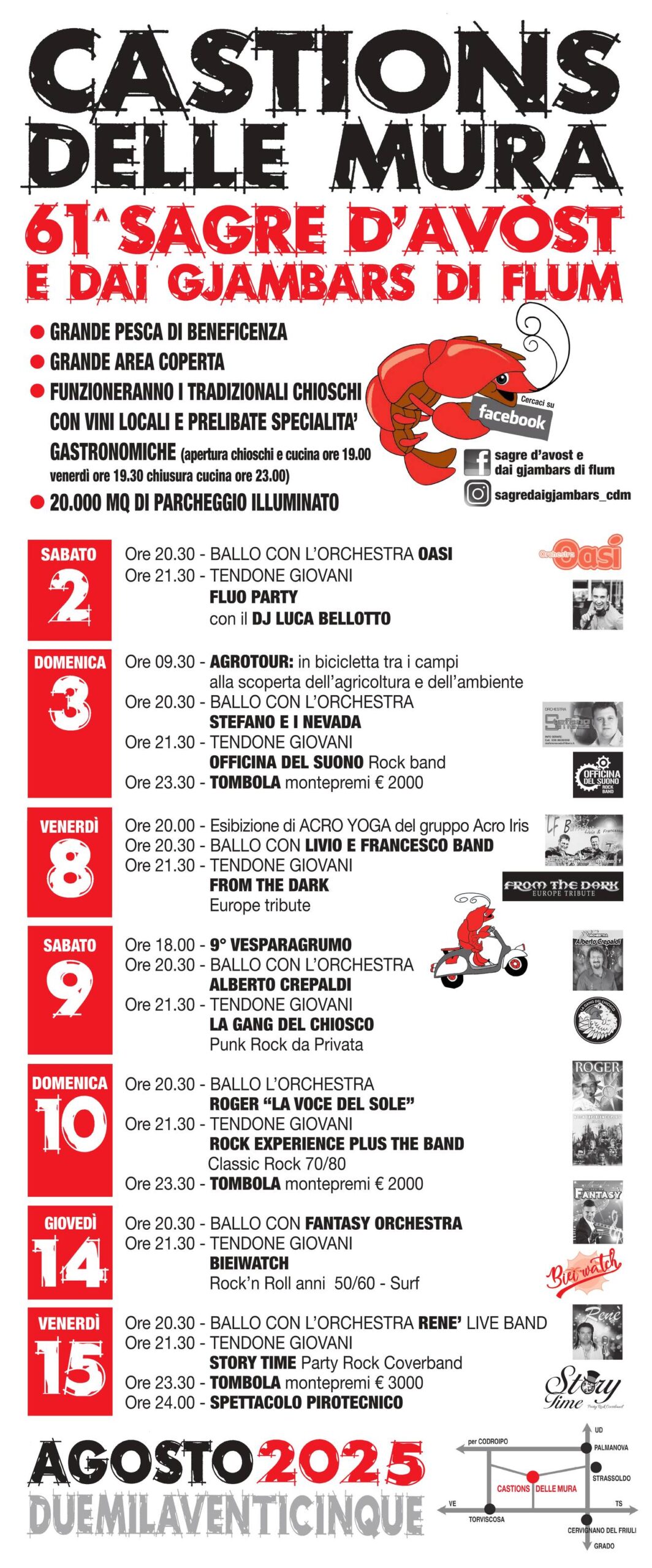 Giunta alla sua 61ª edizione,la Sagra dei Gamberi di Fiume di Castions delle Mura, è una mitica e allegrissima sagra nella bassa friulana che durerà per ben tre settimane. I gamberi qui sono buonissimi, anche se ci si sporca un po’ le mani a sbucciarli. E li troverete in diverse versioni, gamberi con olio, prezzemolo e aglio, o alla friulana, oppure come sugo per la pasta. Ma qui troverete anche pasticcio, calamari, mezzancolle alla griglia, grigliata mista, galletto, dolci e molto altro. Ma non mancheranno i divertimenti, con l’immancabile (e affollatissimo) raduno di Vespa (sabato 9), con musica e ballo ogni sera grazie alla presenza di tante band di liscio, come “Stefano e i Nevada”, “Livio e Francesco Band”, “Orchestra Oasi”, “Alberto Crepaldi”, “Roger la Voce del Sole”, “Orchestra Fantasy” e il mitico “Renè”. Ma ci sarà spazio anche tanti concerti per i più giovani e non. Il tendone giovani ospiterà ogni sera un live diverso con gli “Officina del suono”, “From the Dark” (Europe tribute Band), “La Gang del Chiosco”, “Rock Experience Plus The Band”, i “Bieiwatch” e gli “Story Time”.