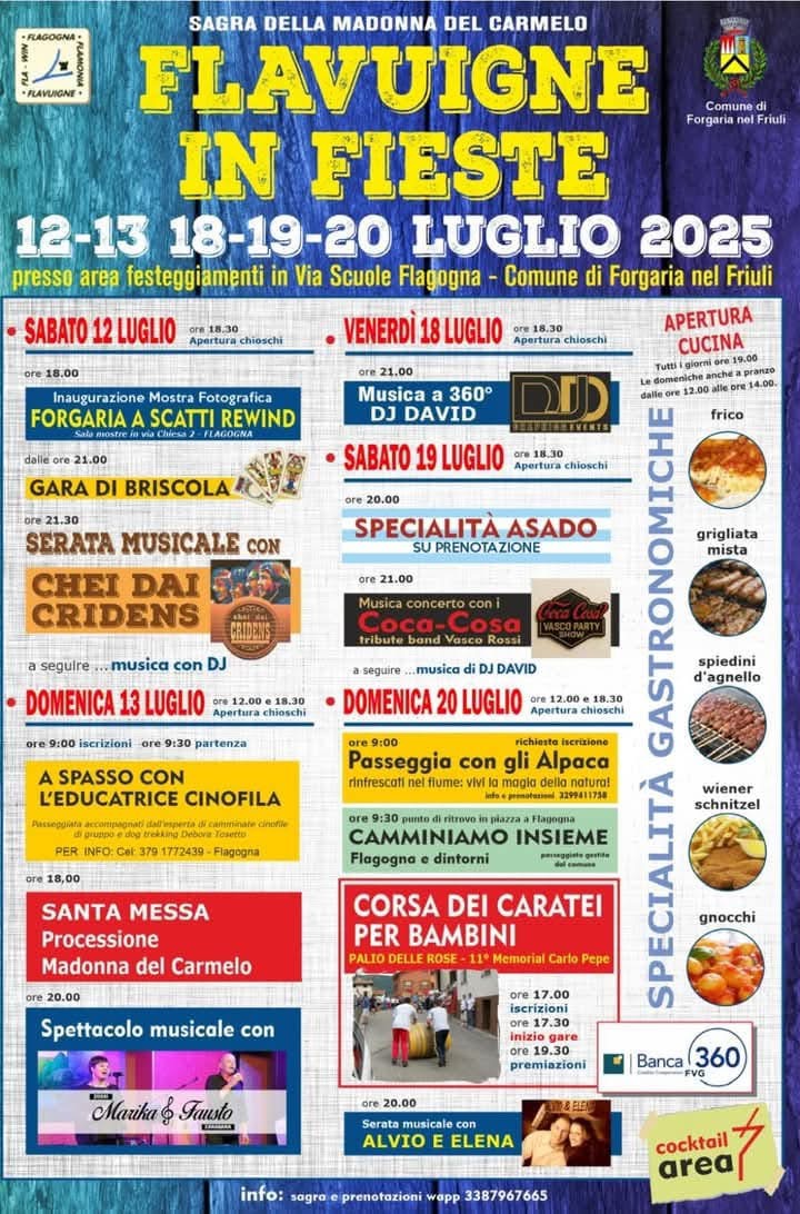 Presso l’area festeggiamenti di Flagogna, per due fine settimana torna “Flavuigne in Fieste”. Una festa con un programma ricchissimo e davvero per tutti. Qui troverete chioschi aperti con specialità Frico, grigliata mista, spiedini d’agnello, wienerschnitzel, gnocchi e tanto altro. Ma anche ornei di briscola, passeggiate con gli alpaca, corsa dei Caratei per bambini, passeggiate naturalistiche e tanta musica dal vivo assieme ai Coca Cosa (Tribute Band di Vasco Rossi), “Chei dai Cridens”, “Marika & Fausto”, “Dj David” e “Alvio & Elena”.