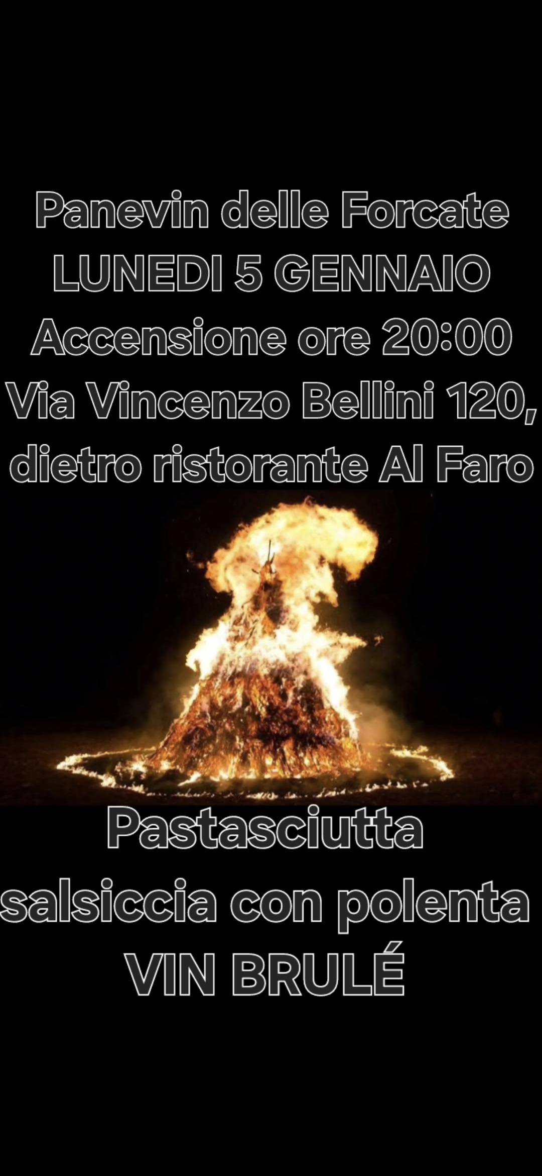 In Via Vincenzo Bellini 120, dietro il ristorante Al Faro, alle ore 20 è prevista l’accensione del Panevin delle Forcate. Pastasciutta, salsiccia con polenta e VIN BRULÉ per tutti. Accensione garantita anche in caso di pioggia.