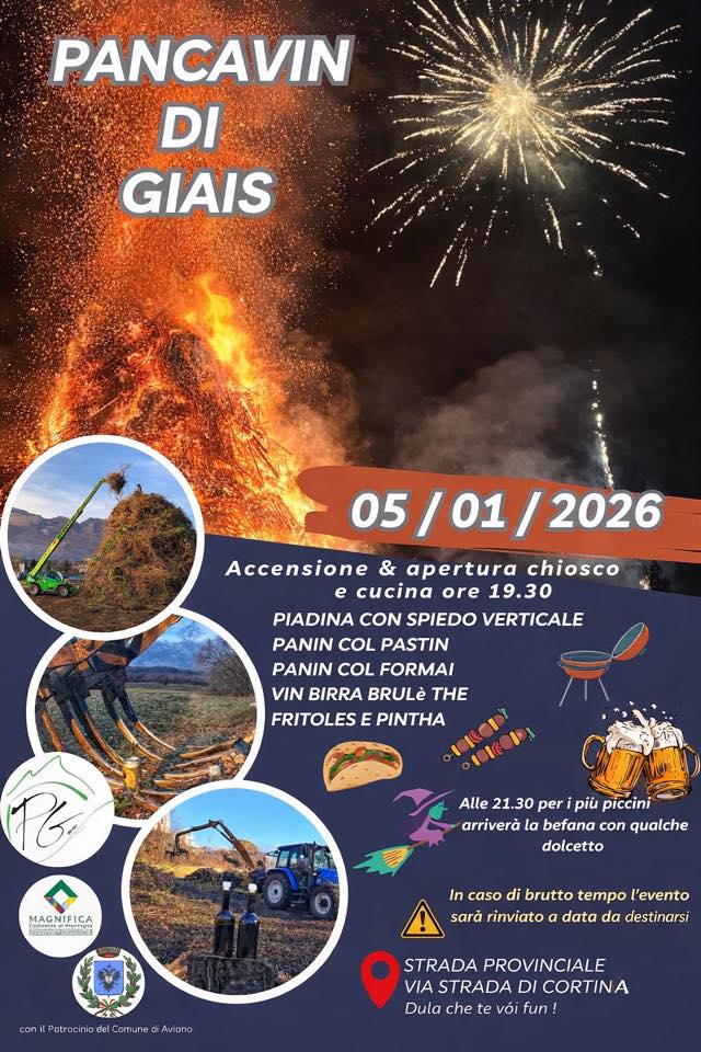 Il grande pancavin di Giais si accenderà Lunedì 5 Gennaio, alle ore 20.30. La cucina e i chioschi invece apriranno alle ore 19.30 con tante specialità come piadina con spiedo verticale, panini con pastin e formai, fritoles, pinza e bevande calde. Alle 21.30 arriverà la befana con dolciumi per i bambini.