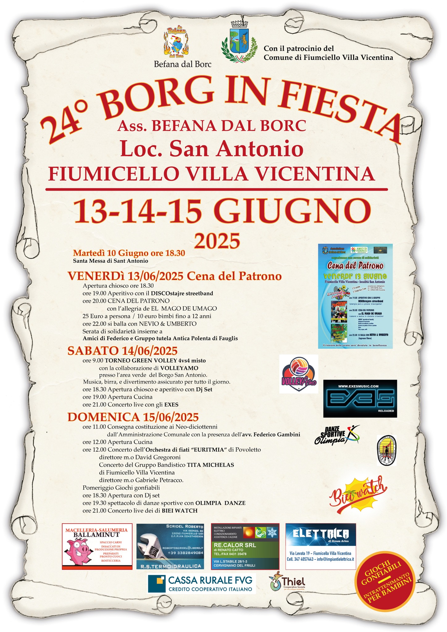 Qui per 4 giornate si potrà ridere in compagnia del mitico Mago di Umago, ascoltare ottima musica live con i Disco Stajare Street Band, gli Exes e i Biei Watch. Si ballerà con Nevio e Umberto, si potrà assistere al torneo di Green Volley, ammirare delle esibioni di ballo e assistere al concerto bandistico dell’orchestra di fiati “euritmia” di Povoletto. Ovviamente non mancheranno fornitissimi chioschi eno-gastronomici.