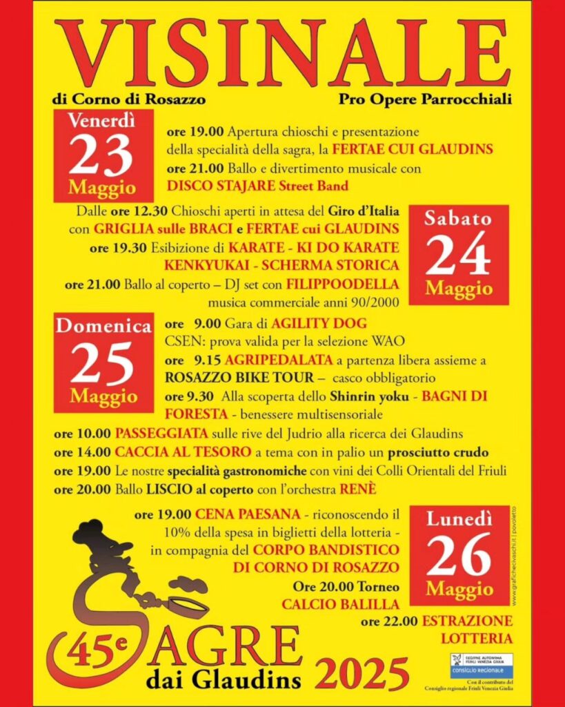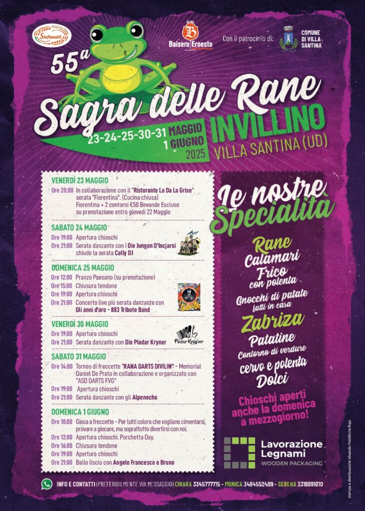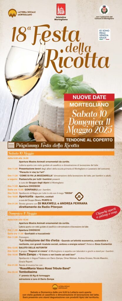 Qui troverete la mostra mercato con prodotti agroalimentari e di artigianato (Solo Domenica), Musica itinerante con i bravissimi “Disco Stajare Street Band” e serata danzante con il gruppo folk “El Canfin”, passeggiate naturalistiche, visite alla miniera di Cludinico, tennis da tavolo, e fornitissimi chioschi con polenta, frico, salsiccia, cappucci e panini.