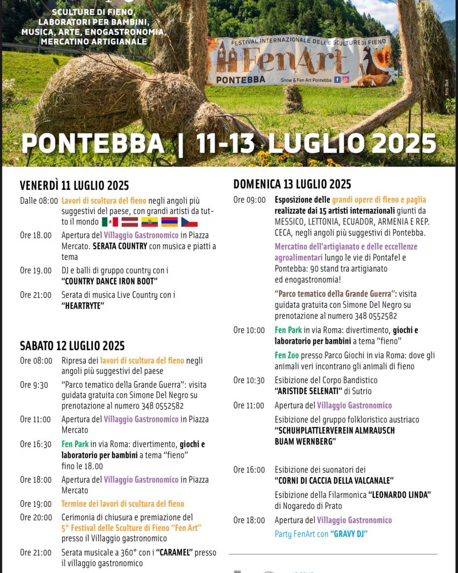 Paglia e fieno, un intreccio di colori e profumi, che danno vita a fantastiche sculture fatte dai più importanti artisti internazionali e mondiali. A Pontebba, dal 11 al 13 luglio, FenZoo, FenPark, laboratori e giochi per bambini, musica dal vivo, arte, passeggiate tematiche, enogastronomia, mostre e mercatini.