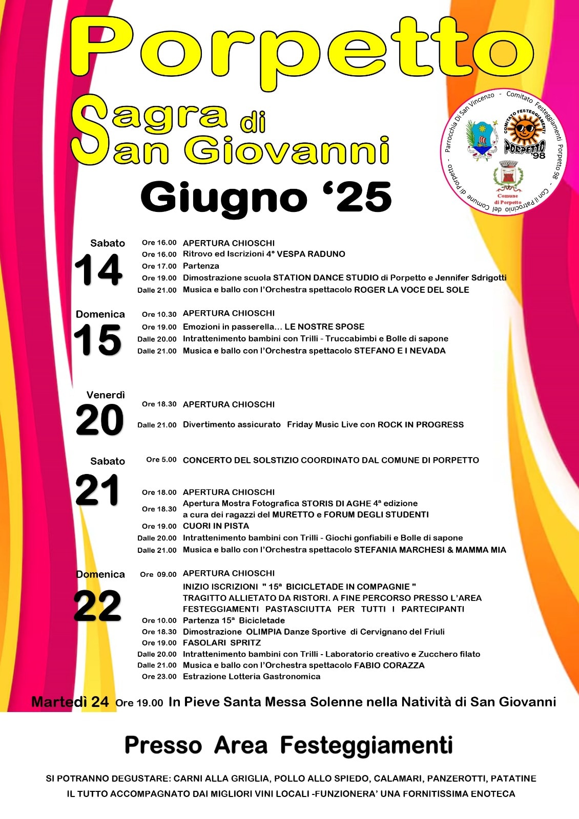 La tradizionale sagra organizzata dal Comitato Festeggiamenti “Porpetto’98” si svolgerà in due fine settimana con serate musicali e danzanti, una ricchissima lotteria gastronomica, fornitissima enoteca con i migliori vini locali e uno stand gastronomico con carni alla griglia, pollo allo spiedo, calamari, panzerotti e patatine. Il programma 2025 vedrà coinvolte grandi orchestre da ballo come Roger e la voce del Sole, Stefano e i Nevada, Stefania Marchesi e i Mamma Mia Band e Fabio Corazza. ma anche ballli di gruppo con “Cuori in Pista”, una maratona rock,