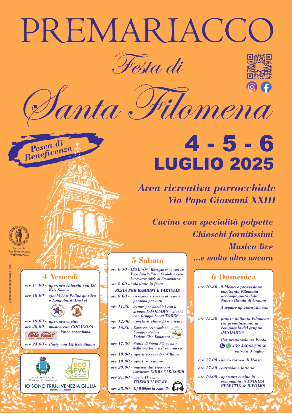 Torna dopo 19 anni la FESTA DI SANTA FILOMENA a Premariacco!  Dopo quasi due decenni di attesa, Premariacco si prepara a risplendere di musica, buon cibo e tanta allegria!