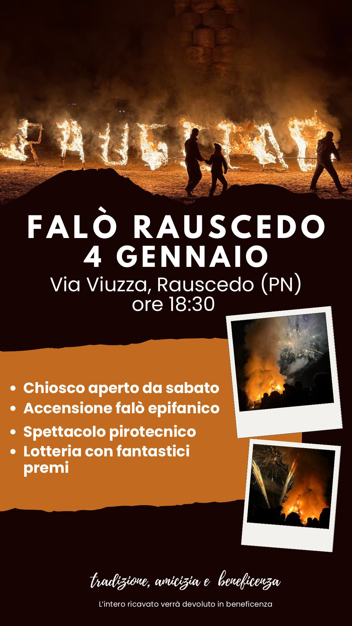 Domenica 4 Gennaio in via Viuzza a Rauscedo, verrà acceso il grande falò epifanico alle ore 18.30. I chioschi eno-gastronomici apriranno però già il giorno prima, il 3 gennaio.