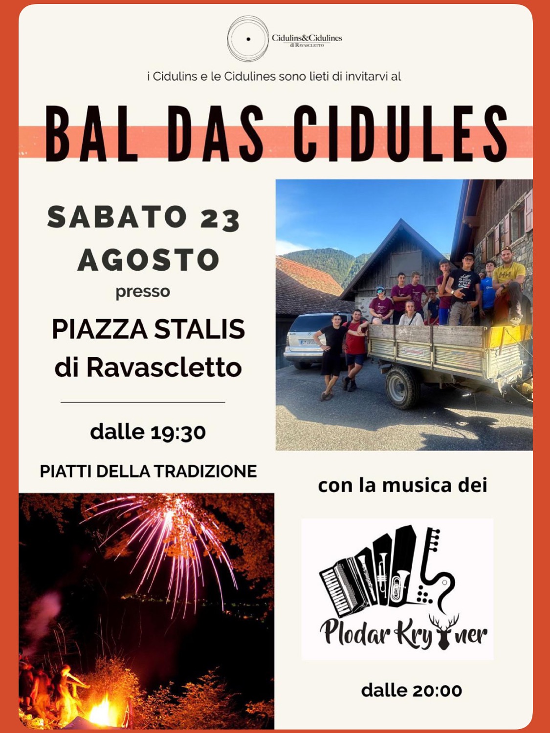Organizzata dall’associazione “Cidulins e Cidulines” di Ravascletto, questa giornata di festa vuole festeggiare tutti i cidulins (i lanciatori di questi cerchi infuocati, antica tradizione della Carnia). Ma cosa succederà in questa festa? Sarà una tradizionale serata danzante con chioschi gastronomici, la musica dal vivo dei “Plodar Kryner” e l’accoglienza dei cidulârs.