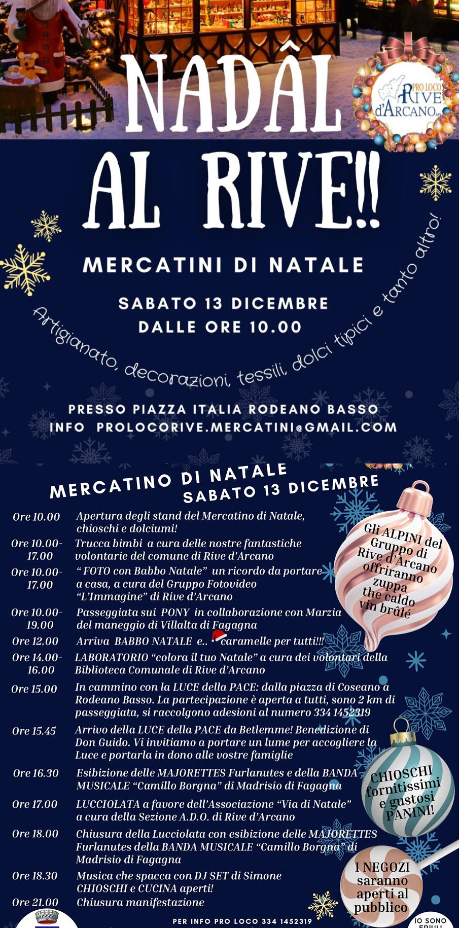 La nuova proloco di Rive d’Arcano, organizza una giornata di festa in attesa del Natale. Qui, solo sabato 13, potrete trovare Mercatino, chioschi eno-gastronomici, dolciumi, animazione per bambini, con truccabimbi, giri con i pony, laboratori creativi e ovviamente l’arrivo di Babbo Natale.