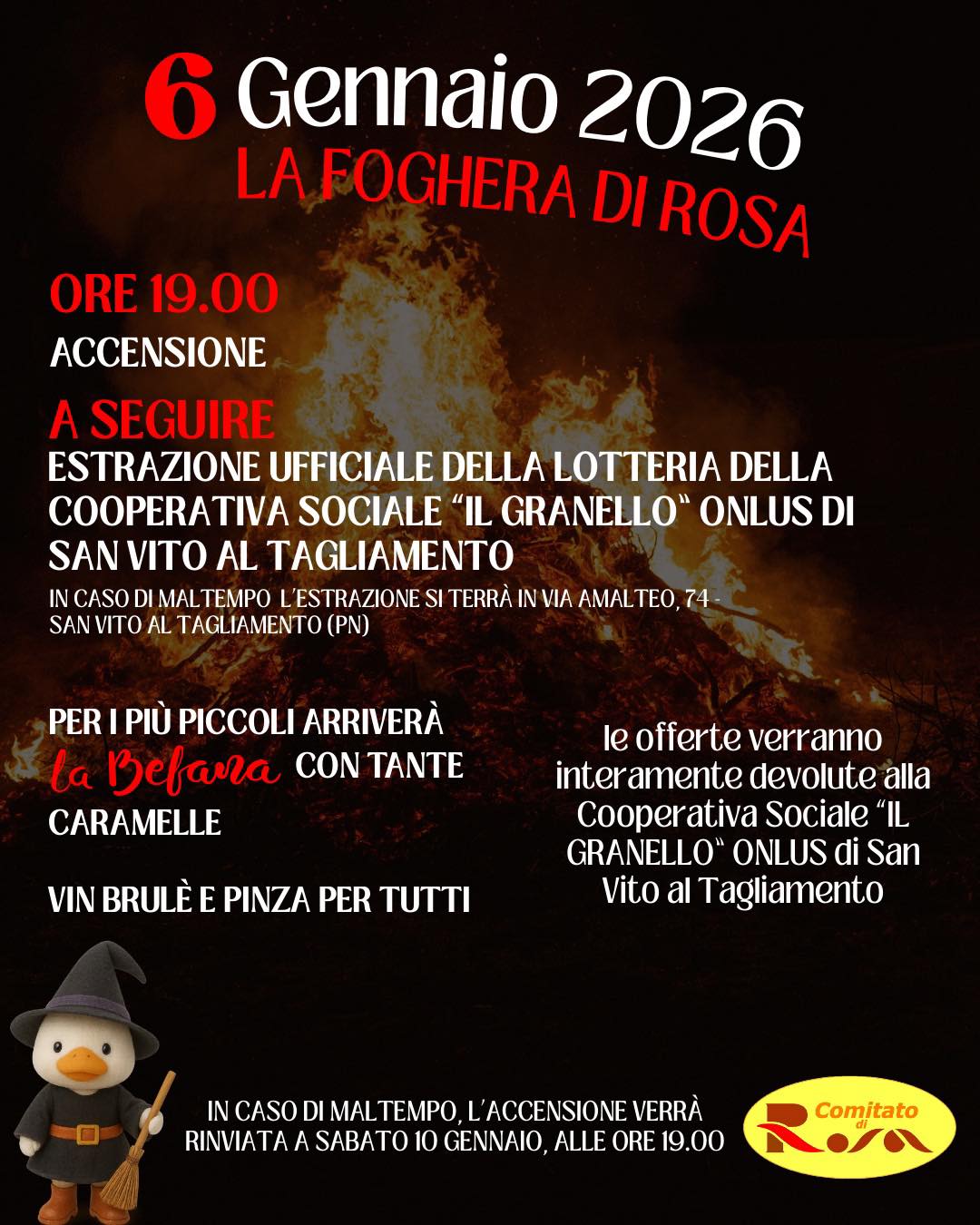 Martedì 6 gennaio alle 19.00 a Rosa di San Vito al Tagliamento si accenderà la grande “Foghera”. Non mancheranno brulè e pinza e ovviamente la Befana che porterà dolciumi a tutti i bambini. A seguire prevista l’estrazione della lotteria di beneficenza.