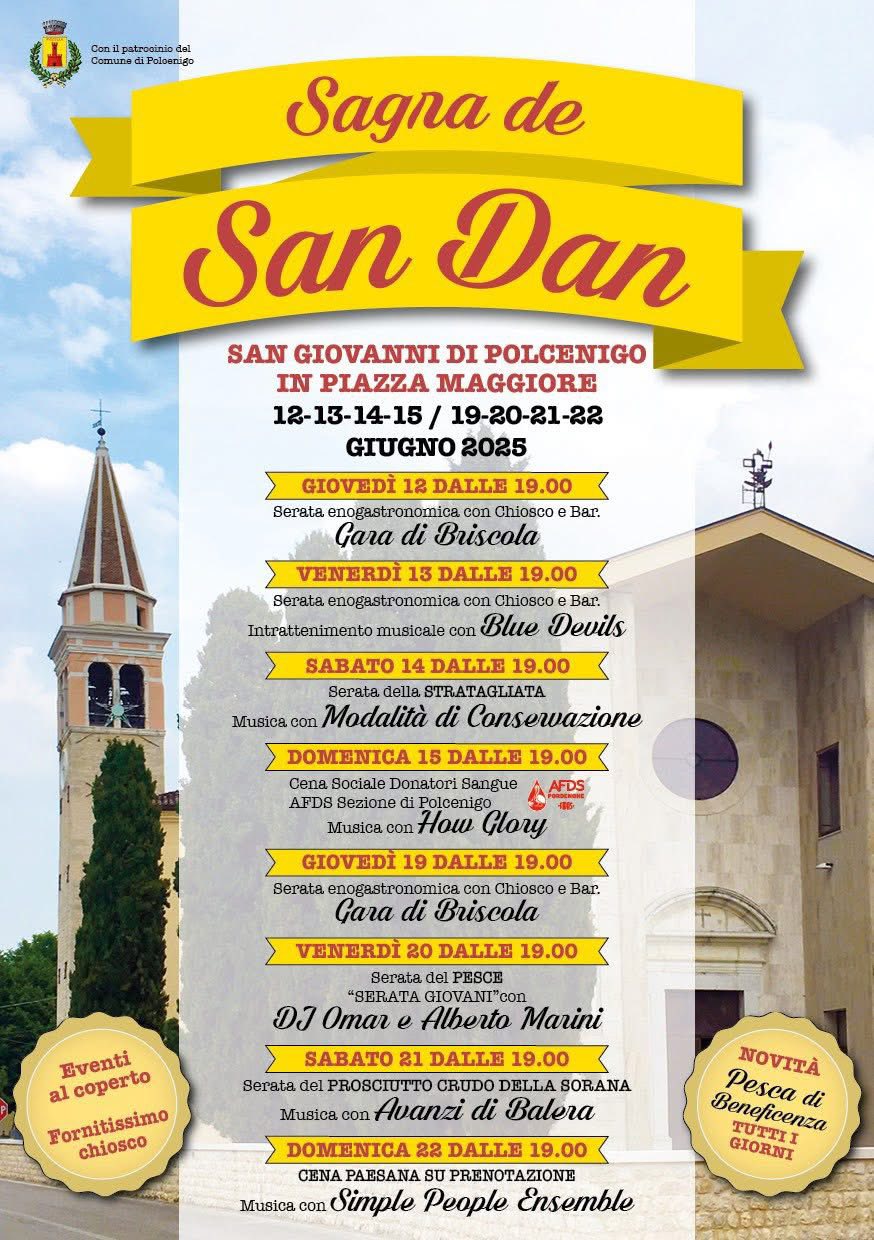 La Sagra de San Dan a San Giovanni di Polcenigo è la tradizionale festa patronale che celebra San Daniele (San Dan, in dialetto friulano), molto sentita dalla comunità locale. Per due fine settimana, in Piazza Maggiore, vi attenderanno intrattenimenti musicali con i “Blue Devis”, “Modalità di Conservazione”, “How Glory”, “Avanzi di Balera”, “Simple People Ensemble”, “Dj Omar e Alberto Marini”. Ogni sera apriranno fornitissimi chioschi eno gastronomici con carni alla griglia e specialità della tradizione. Con alcune serate a tema come la serata “Stratagliata” o quella dedicata al “pesce” oppure quella dedicata al “Prosciutto crudo della Sorana”. A conclusione del programma previste diverse gare di briscola e la novità 2025, la mitica Pesca di Beneficenza.
