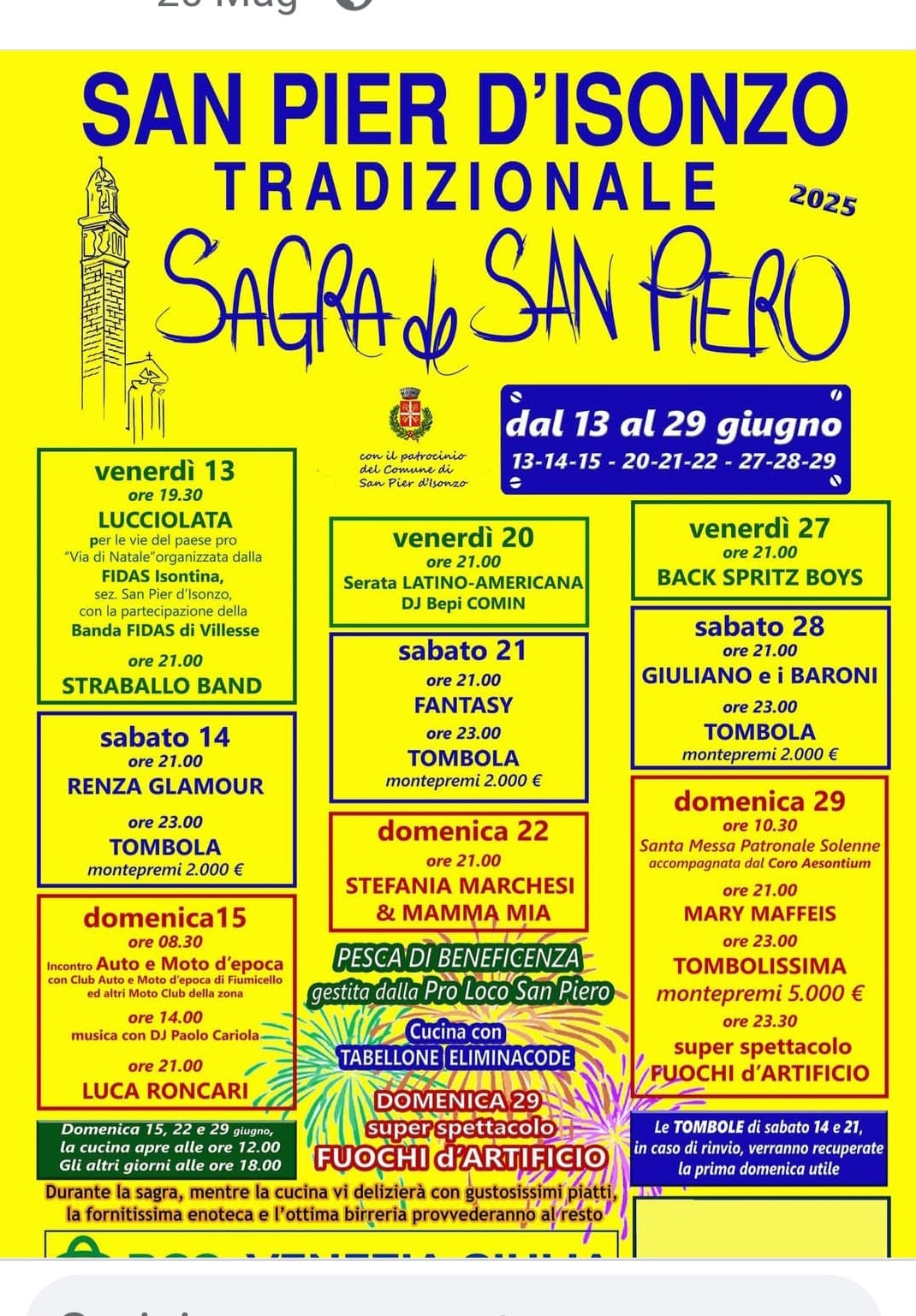 Questa tradizionale festa, organizzata in onore del Santo Patrono San Pietro Apostolo, si terrà nell’area delle feste della parrocchia, situata in via Roma 36, San Pier d’Isonzo (GO). La sagra offrirà un ricco menù di prelibatezze culinarie che delizieranno ogni palato con: Gnocchi fatti a mano al ragù, Carne alla griglia: pollo, costa, cevapcici, spiedini, salsiccia, Lonza e gulasch. La sagra vanta anche una birreria e un’enoteca con una selezione di vini locali e non solo.