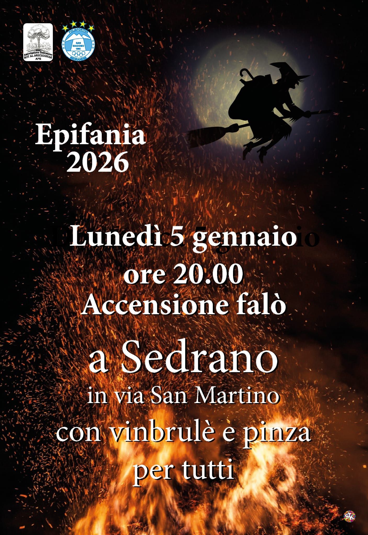 Lunedì 5 Gennaio alle ore 20, in via san martino a Sedrano, si accenderà il grande falò epifanico, con vin brulè e pinza per tutti!