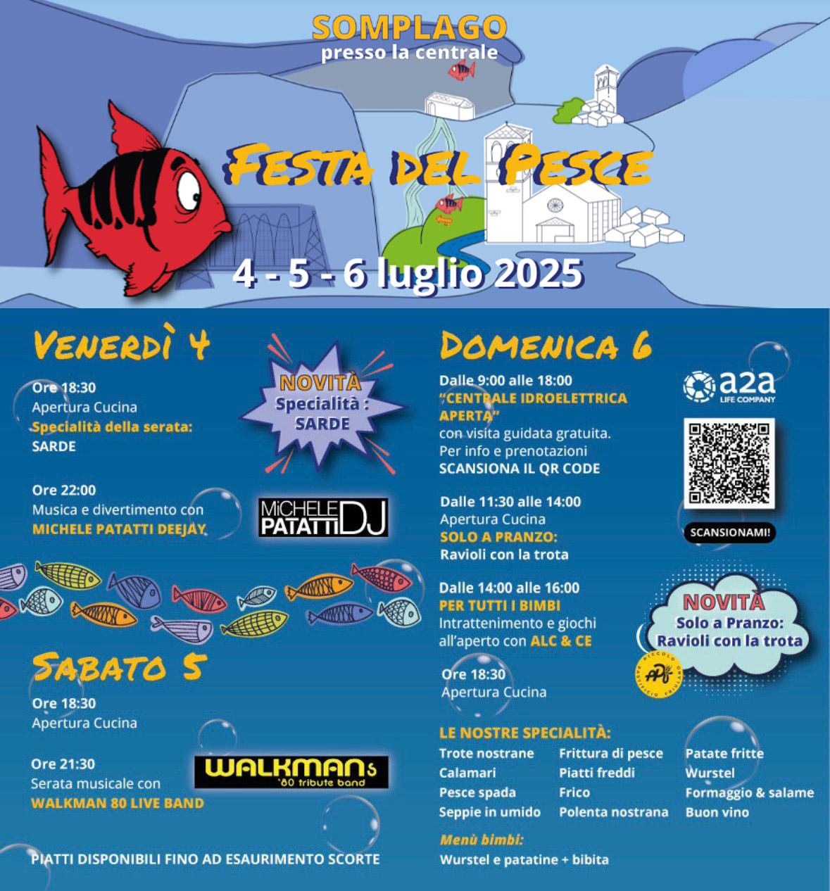 Per tre giorni qui potrete trovare menù a tema ogni sera diversi con la serata “sarde” e la serata “ravioli con la trota”, ma ci saranno anche calamari, seppie, fritto misto e frico, wurstel, formaggio e molto altro. Non mancherà la musica con Michele Patatti dj e i Walkmans 80, ma qui troverete anche animazione per i bambini (solo domenica) e le interessanti visite guidate alla centrale elettrica di Somplago (solo domenica)-