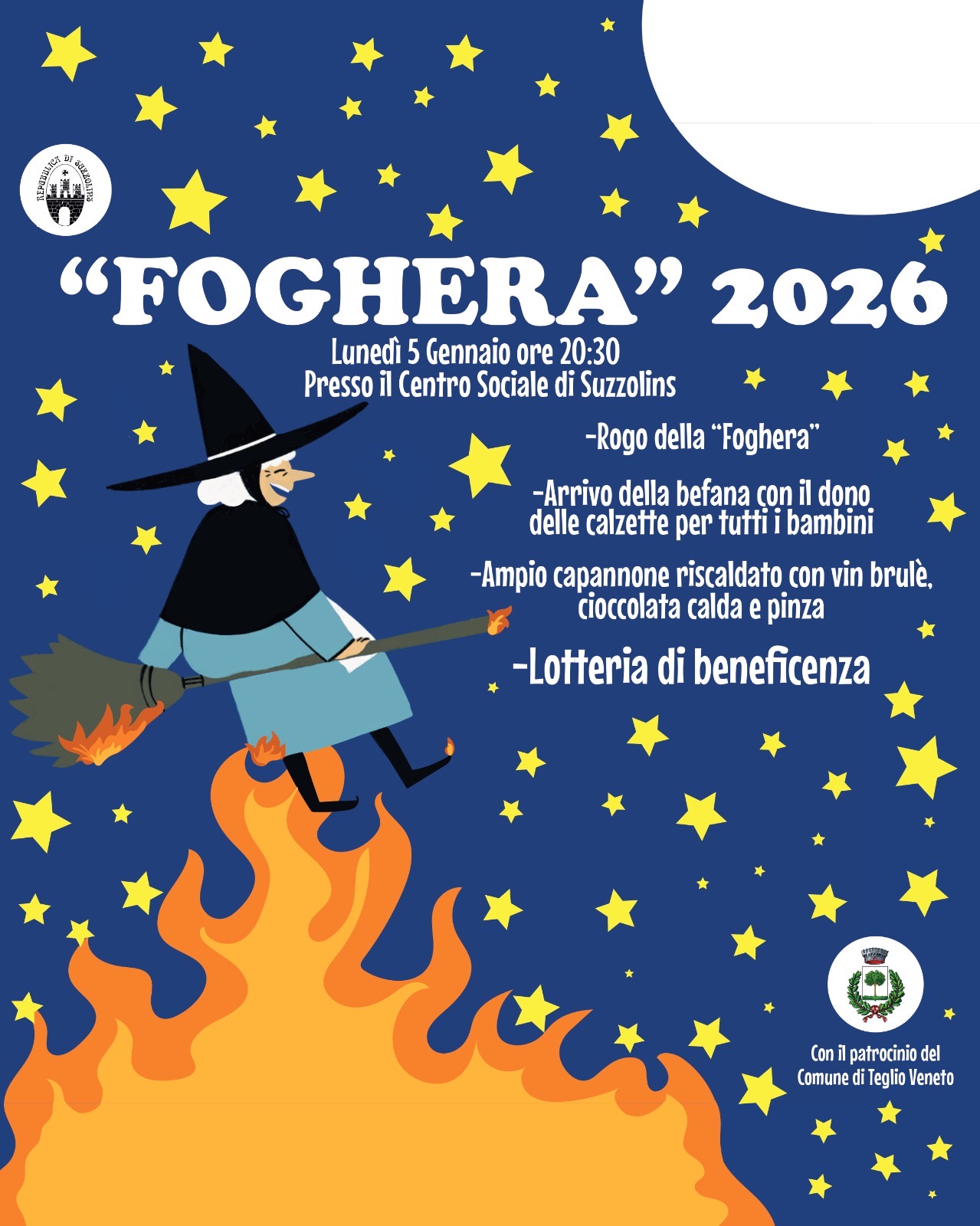 Lunedì 5 Gennaio alle ore 20.30 si accenderà la “Foghera” anche a Suzzolins. Presso il centro sociale di Suzzolins arriverà anche la befana con calze per tutti i bambini, e in comodo e grande tendone riscaldato troverete bevande calde e l’immancabile pinza. A conclusione Lotteria di beneficenza.