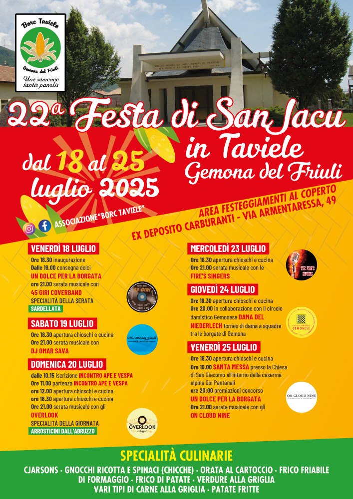 L’associazione di Borgata Borc Taviele, organizza, presso l’area festeggiamenti di Via Armentaressa, la 22^ edizione della Festa di San Jacu. Tante le specialità culinarie e i ricchi chioschi che proporranno Cjalsons, gnocchi con ricotta e spinaci, orata al cartoccio, frico friabile, frico di patate, verdure alla griglia, carni alla griglia, patate fritte e molto altro. Inoltre ci saranno delle speciali serate con menù a tema, come quella dedicata agli arrosticini abbruzzesi o quella dedicata alla sardellata.