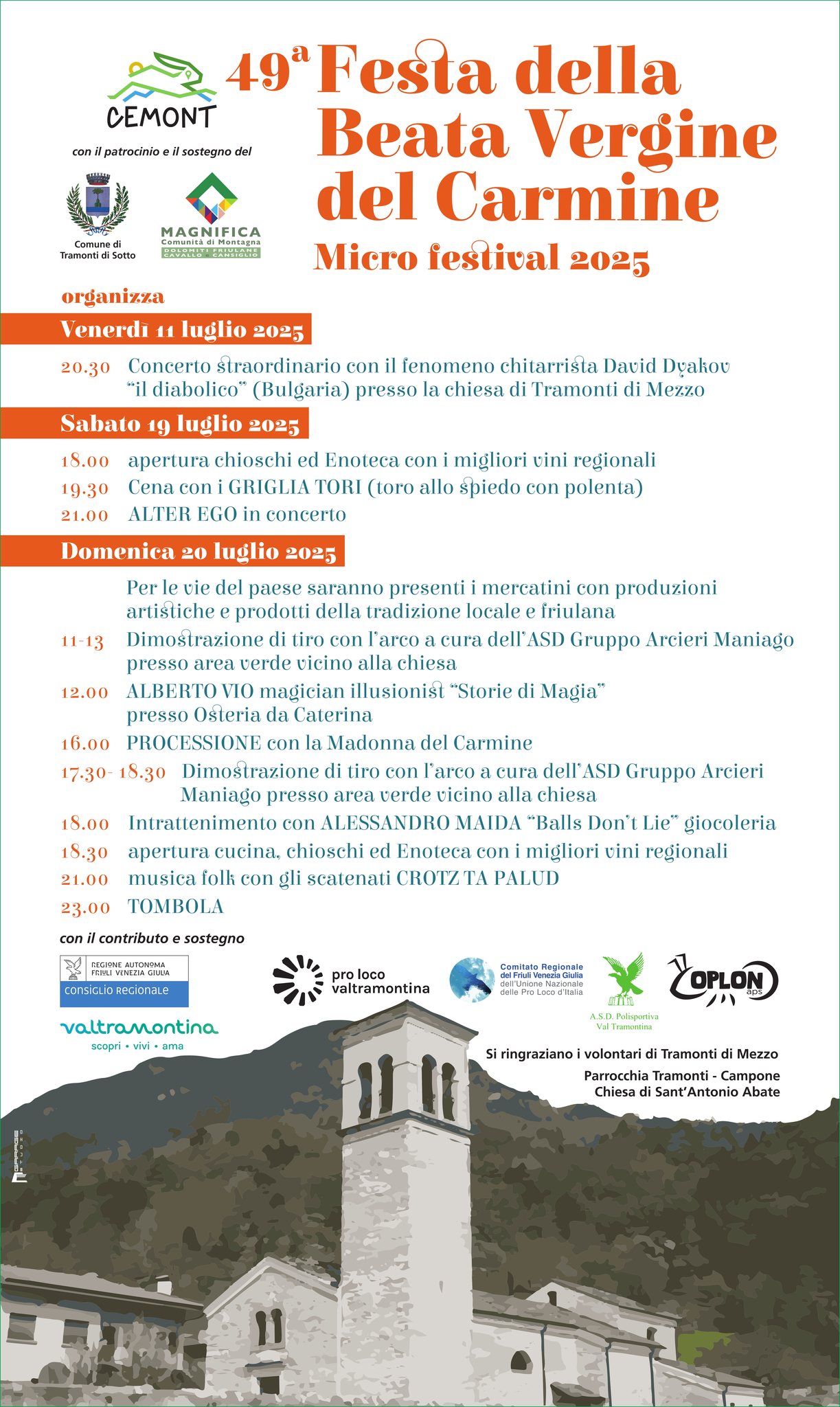 Torna la tradizionale Festa dedicata alla Beata Vergine del Carmine in Val Tramontina! Due giorni di musica, gusto, spettacoli e tradizione nel cuore del borgo di Tramonti di Mezzo.