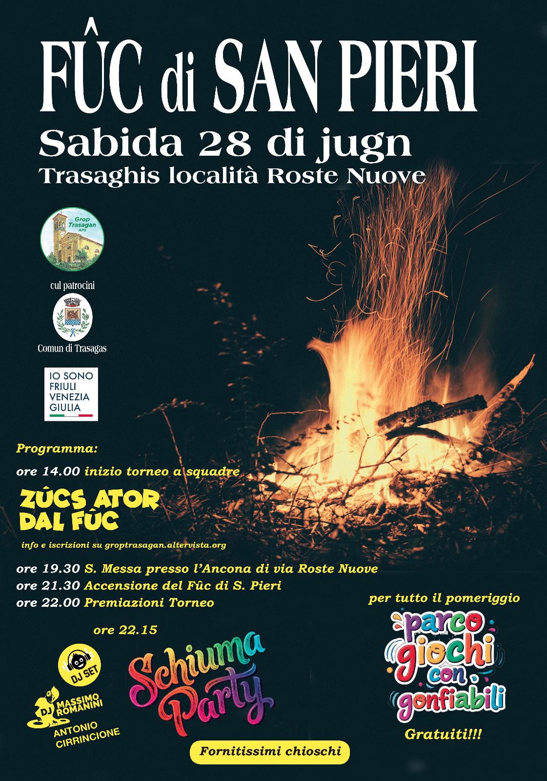 Anche Trasaghis accende grandi falò in questo periodo del solstizio! E per una giornata si farà festa attorno al fuoco, con tornei sportivi “Zûcs Ator Dal Fûc” , Accensione del fuoco, Schiuma Party, Musica, Dj Set e fornitissimi chioschi eno-gastronomici.