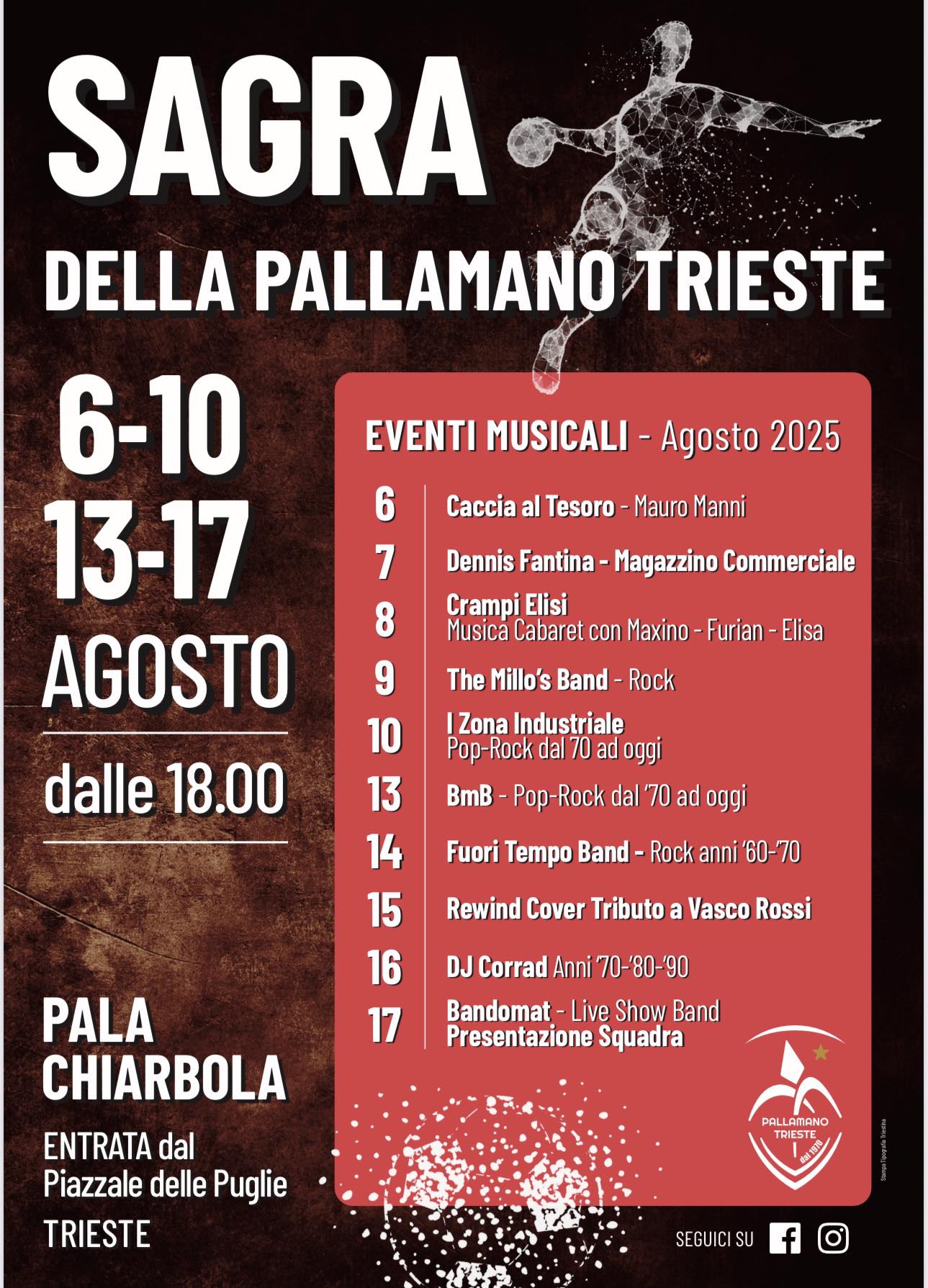 La recente sagra triestina, organizzata dalla celebre società giuliana di Pallamano, è una festa che ha come location il parcheggio del Palasport di Chiarbola. Ogni sera dalle ore 18 apriranno i fornitissimi chioschi eno-gastronomici con ottime carni alla brace, vino e birra e si potrà assistere ad un concerto diverso ogni sera, tra tribute band, concerti rock, Revival e tanto altro. TRa i nomi in line-up spicca di certo quello del Triestino Dennis Fantina, vincitore della primissima edizione di Amici.