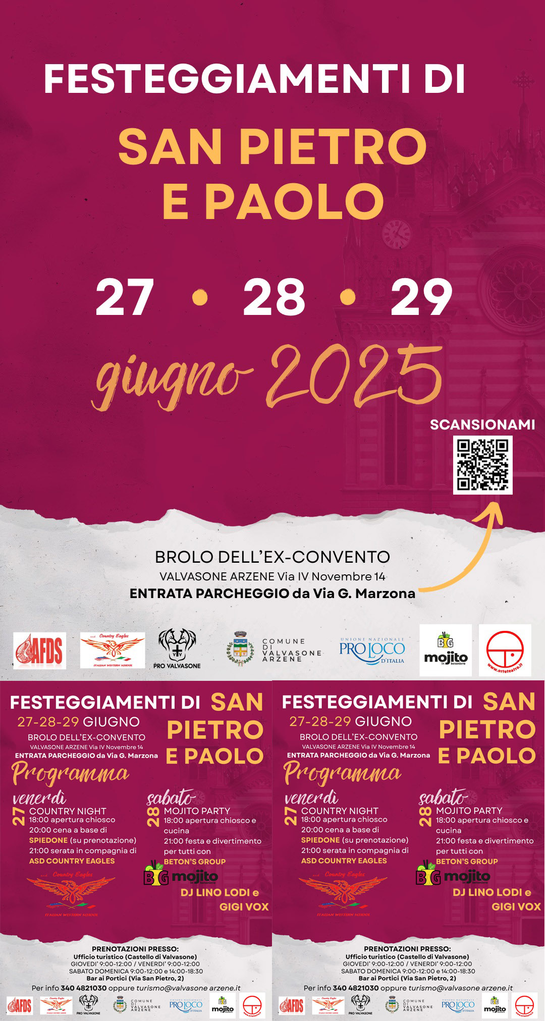 A Valvasone si Festeggiano i Santi Patrono Pietro e Paolo con tre giorni di festa per tutti i gusti. Dalla serata a tema Country (venerdì) con i “Country Eagles” e cena a base di spiedone, alla serata giovani Mojito Party (sabato), organizzata da Beton’s Group ovvero quelli che fanno il Mojito in Betoniera!, assieme a dj LIno Lodi e Gigi Vox, alla festa patronale (domenica) con visita guidata al Castello di Valvasone, celebrazioni religiose e pranzo paesano.
