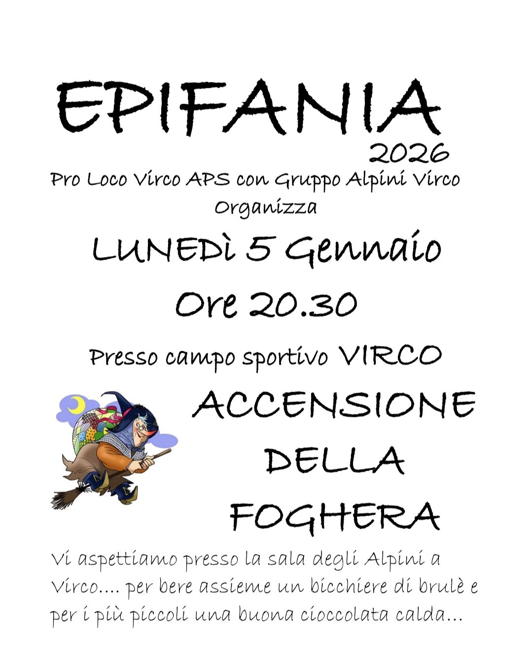 Il 5 Gennaio, presso il campo sportivo di Virco, alle ore 20.30 si accenderà la Grande Foghera di Virco! Non mancheranno bevande calde per tutti.