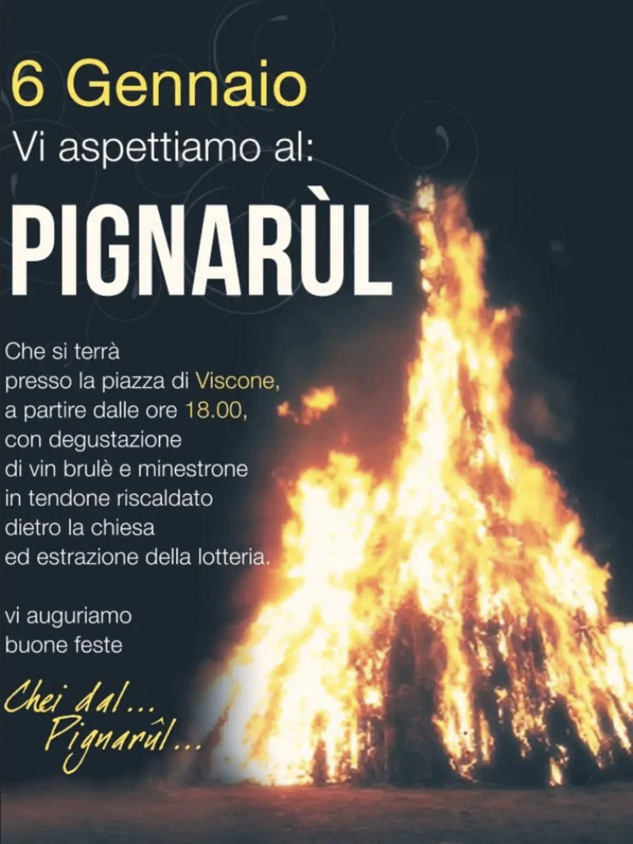 Il 6 Gennaio alle ore 18.00 si accenderà il grande PIgnarûl di Viscone (UD). Non mancheranno bevande calde, minestrone e la mitica lotteria. Tutto dentro ad un comodo tendone riscaldato! (Tranne il Pignarûl) 🙂