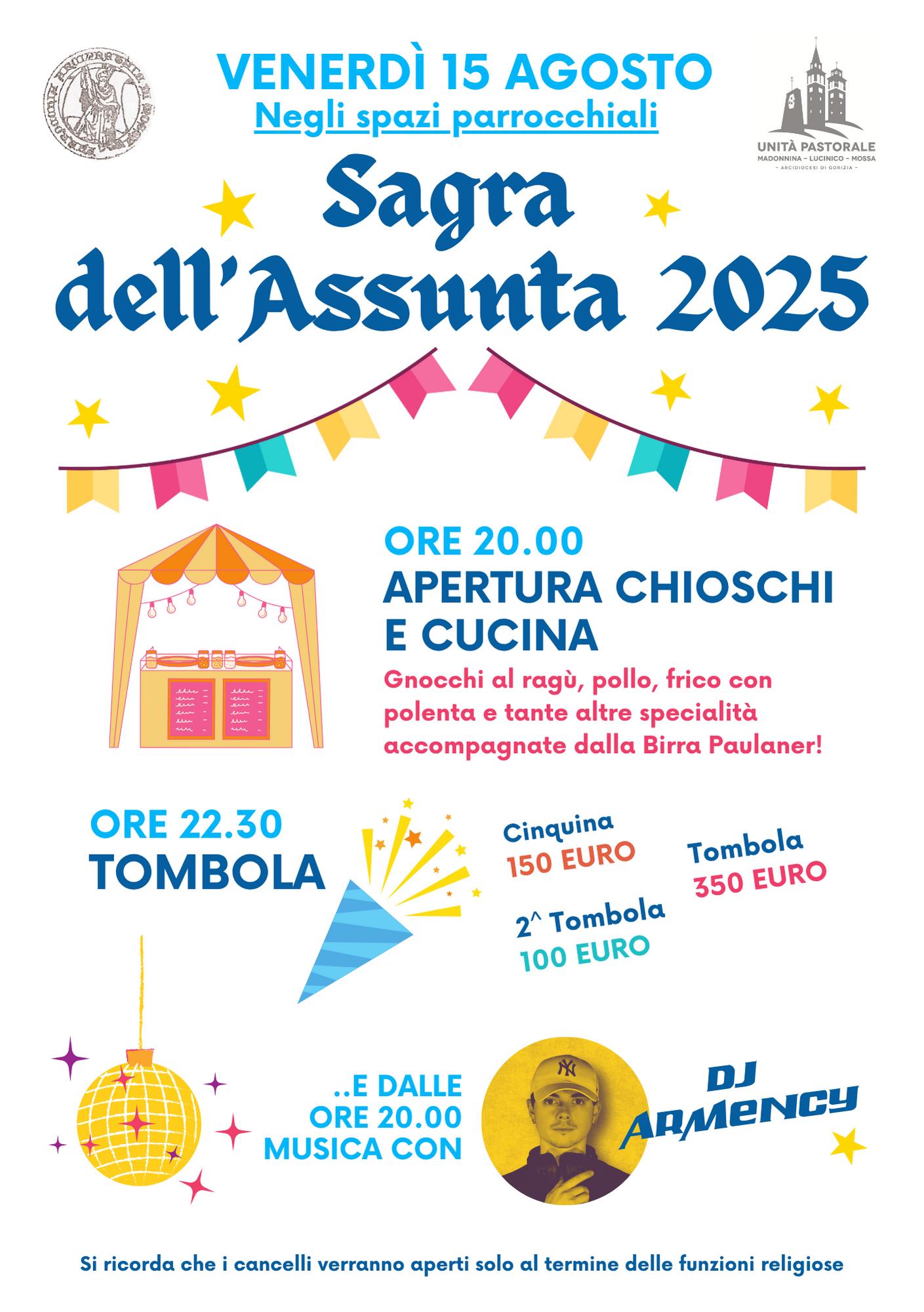 L’unità Pastorale di Lucinicco, Mossa e Madonnina, organizza ogni anno questa Festa Patronale in cui, oltre alle funzioni religiose, troverete fornitissimi chioschi aperti dalle ore 20, musica con Dj Armency, e alle 22.30 Tombola!