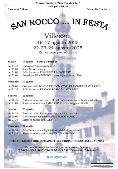 i tradizionali Festeggiamenti di San Rocco a Villesse, prevedono concerti gratuiti ogni sera, con musica balcanica e folk, ballo liscio e la tribute band dei nomadi (18 agosto). Ma non solo, tanta animazione per bambini (Baby Dance), esibizioni di ballo, sport e tanto buon cibo.