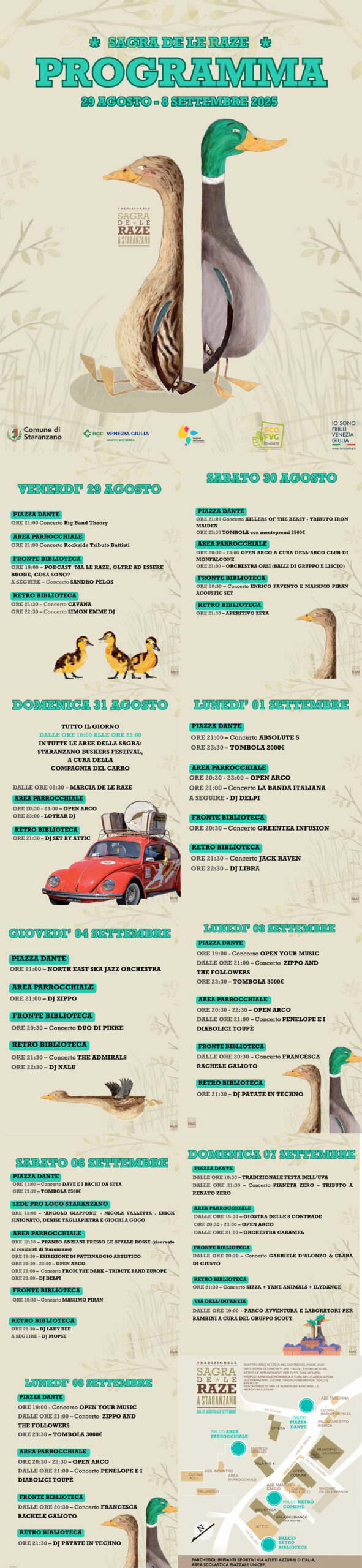 L’antichissima sagra de le Raze (Anatra) di Staranzano, è una delle più longeve, grandi e famose di tutto il Friuli Venezia Giulia. Per 11 giorni il paese si animerà di cultura, musica, cucina e tradizione. Ogni sera ci saranno concerti per i più giovani, cover band e grandi orchestre da ballo, anche contemporaneamente, viso che […]