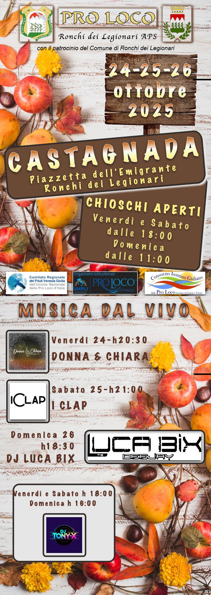 A Ronchi dei Legionari, la Pro Loco, in collaborazione con il Comune, organizzano la Castagnada 2025, un fine settimana dedicato a questo frutto che caratterizza la stagione autunnale. in Piazzetta dell’Emigrante, sono programmati chioschi enogastronomici, concerti e attività per i bambini. Qui si potranno mangiare griglie, patatine e ovviamente castagne e ribolla.La musica live sarà […]