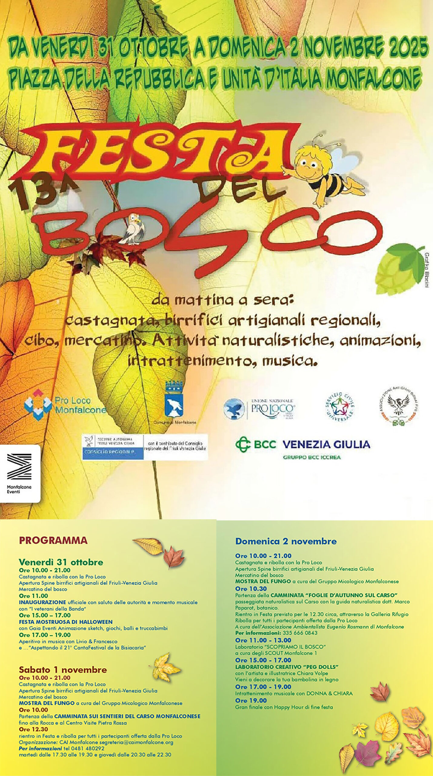 La ormai consolidata Festa del Bosco di Monfalcone, è un’evento organizzato dalla Proloco e dal Comune, creato per valorizzare il territorio e per rendere la città più attrattiva. Qui troverete Castagnata, birrifici artigianali, mercatini, passeggiate naturalistiche immersi nella storia e nella natura del Carso, animazione e laboratori per bambini, mostra micologica, musica dal vivo con “Donna & Chiara” e […]