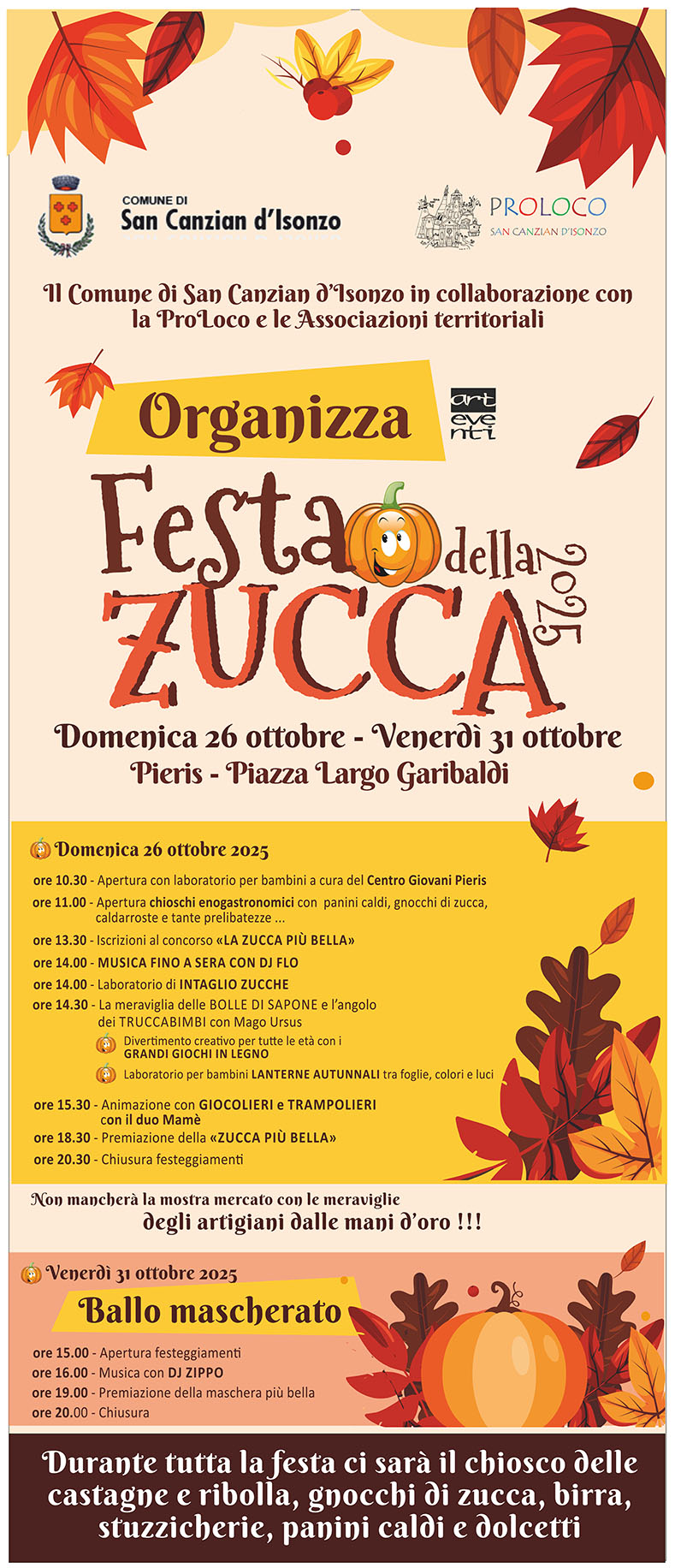 Anche quest’anno la Pro Loco San Canzian, patrocinata dal Comune, organizza la bellissima Festa della Zucca.In piazza Garibaldi a Pieris, domenica 29 e martedì 31 ottobre si apriranno i chioschi e la mostra mercato con tante creazioni realizzate dagli artigiani-hobbisti. Tantissime le animazioni e le attività per i bambini e molto atteso il concorso della […]