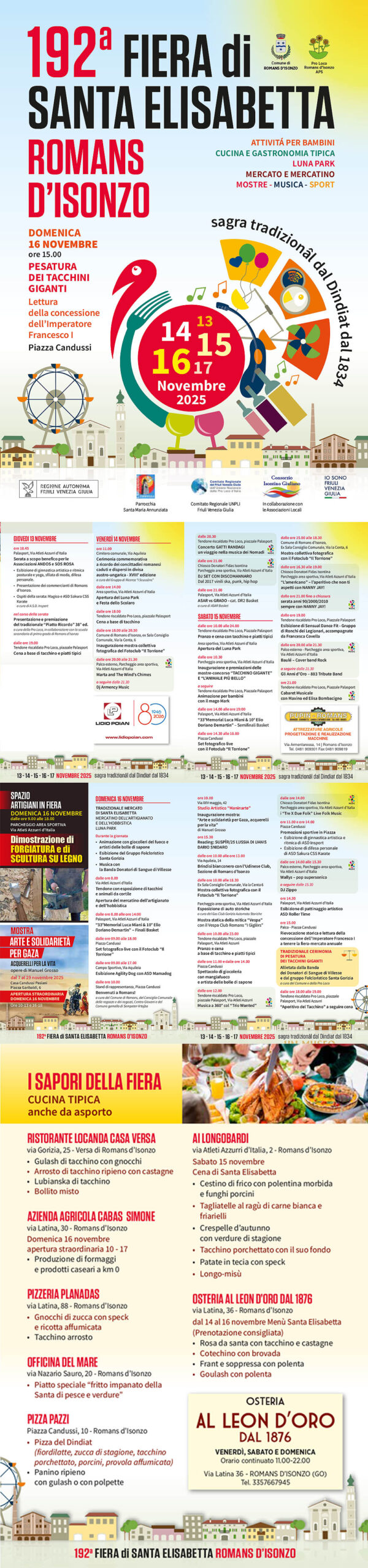 L’antica fiera di Santa Elisabetta di Romans d’Isonzo, quest’anno spegne ben 192 candeline! Le date da segnare sono quelle dal 13 al 17 novembre, con il clou che si avrà domenica 16 novembre con un ricco programma di eventi a corollario della tradizionale pesatura dei tacchini giganti. Il tacchino è il protagonista assoluto della Fiera, non solo per […]