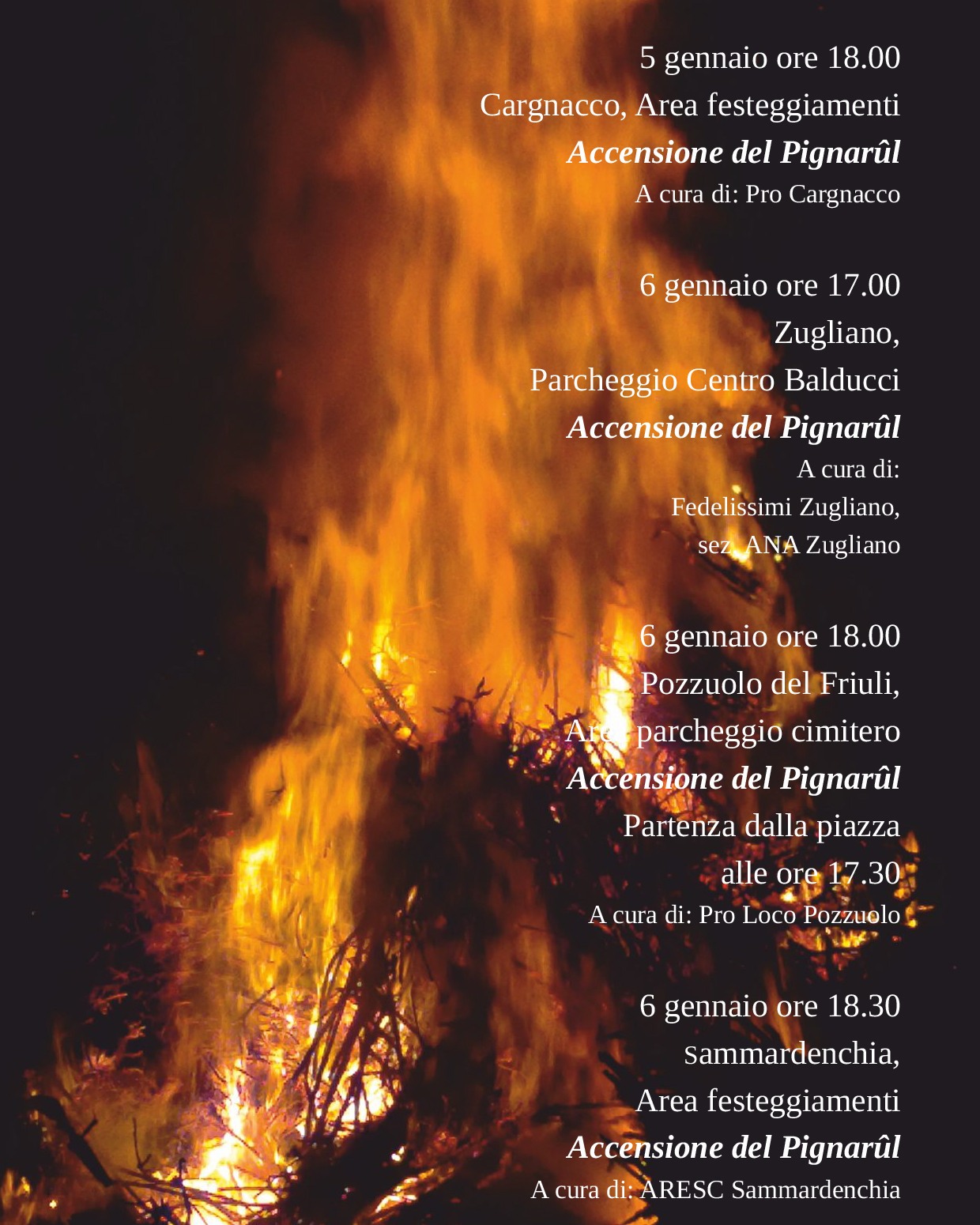 Campomolle di Rivignano Teor Campomolle di Rivignano Teor, Friuli-Venezia Giulia, ItalyIl 5 Gennaio, presso l’area festeggiamenti di Campomolle, ci si ritroverà tutti per riscaldarci attorno al Pignarûl.Ci verrà a trovare la befana, che porterà le caramelle per i bambini. L’Accensione […]